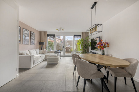 Dankzij de grote raampartijen tot aan de grond is de woonkamer heerlijk licht en heb je volop ruimte voor een royale zithoek en een grote eettafel waar je samen kunt eten, werken of spelletjes doen. De airco zorgt ervoor dat je hier het hele jaar door comfortabel leeft.
